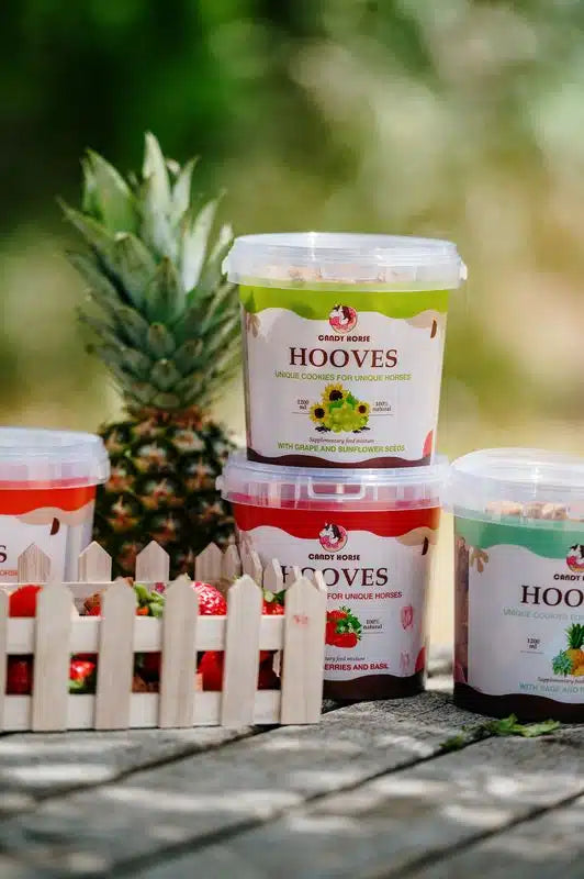 W 100% naturalne, pozbawione dodatkowych cukrów drobne i poręczne smakowite ciasteczka w kształcie „kopytek”. Wypełnione pyszną truskawką i papają, wzbogacone o dużą dawkę siemienia lnianego. Idealna nagroda dla Twojego konia!