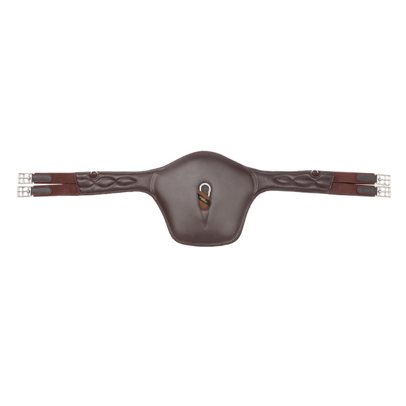 Anatomiczny popręg skokowy, dedykowany dla szczególnie wrażliwych koni. Wykonany z wyjąkowo elastycznej i miękkiej skóry. Dzięki mocno wyciętemu profilowaniu doskonale dopasowuje się do ciała. Nie powoduje blokowania łokcia i nie ogranicza ruchomości. Szeroki fartuch w części mostkowej chroni przed uderzeniami w trakcie skoku. Dwustronne gumy ułatwiają dopięcie popręgu oraz zapobiegają zapoprężeniu. Posiada po bokach dodatkowe oczka D-Ring do podpięcia pomocy. Wygodny karabinek w fartuchu ułatwia zapinanie napierśnika lub wytoku. Mocne sprzączki z rolkami w kolorze srebrnym, wykonane ze stali.